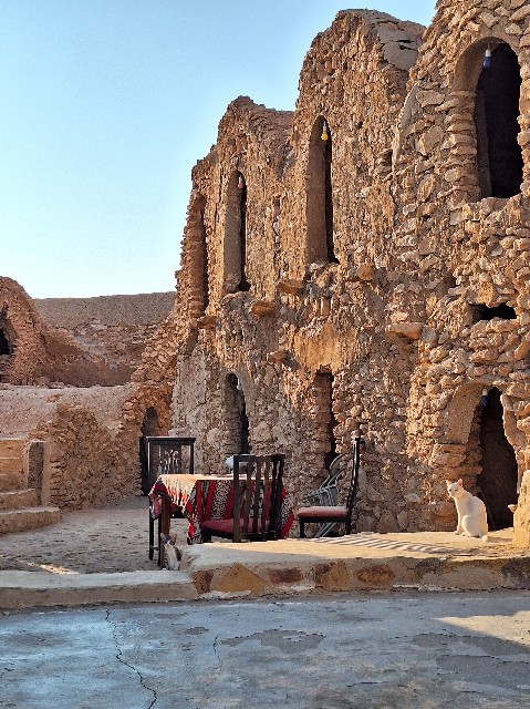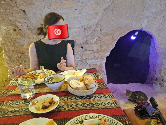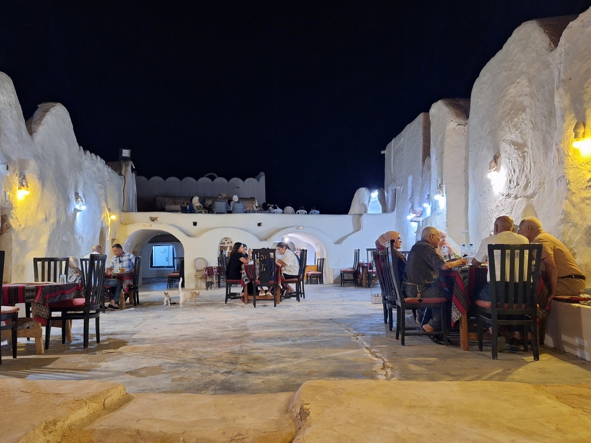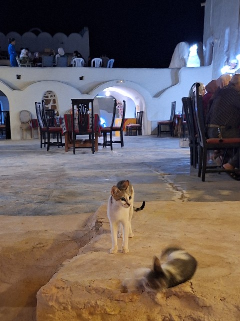 食事中は、賑わう地元のチュニジア人ファミリーや友人グループに混ざりながらの独特な雰囲気でした。時折、クサール内に住み着いている猫たちの喧嘩が始まったりして、それもまた旅の面白いスパイスとなりました。現地の人々の生活に少しだけ触れられているような、特別な体験でした。
