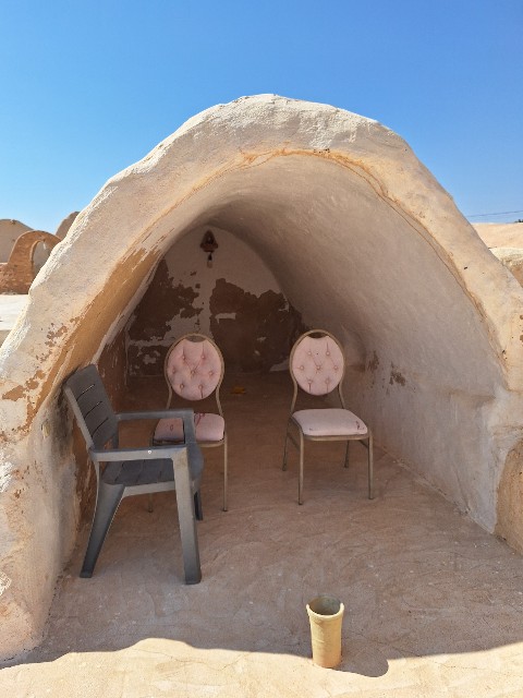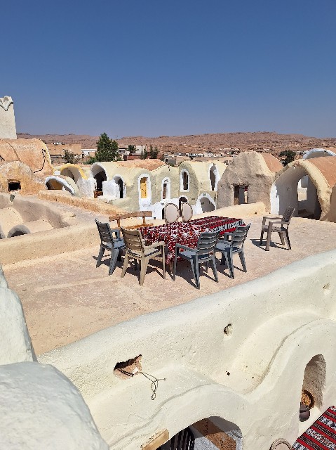 宿泊客である私たちだけの朝食は、ディナーとは異なりスター・ウォーズ風味の装飾が施された区画で提供されました。朝食の内容はシンプルながらも、パンやチーズ、ゆで卵などを中心としたバランスの良い構成でした。チュニジアの美味しいパンに地元のチーズ、新鮮な卵など、素朴ながらも素材の良さが光る朝食で、クサールの静かな朝にぴったりの落ち着いた時間を過ごせました。