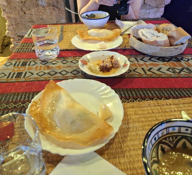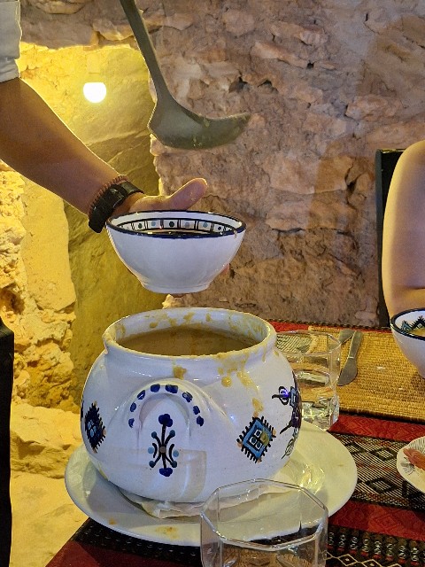 この日のディナーはあらかじめ決まったコース料理でした。まず最初に出てきたのは、レンズ豆のスープ。どろりとした具だくさんの一品でしたが、味わいはあっさりめで、一日の疲れた体に染み渡るような優しい味でした。チュニジアの家庭的な温かさを感じられる、心安らぐスタートでした。