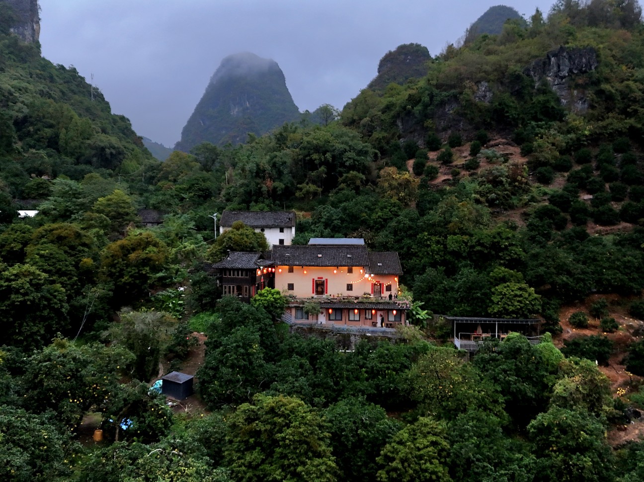 雲舎山宿があるのは、興坪鎮渔村大洲岭という地域で、興坪古鎮からは漓江を挟んで対岸の大河背エリア、そこからさらに山側へ3キロほど入った場所だ。周囲は山と農地、果樹園が広がるのみで、最寄りの集落まで2キロ以上は離れている。まさに隠れ家と呼ぶにふさわしい立地なのである。